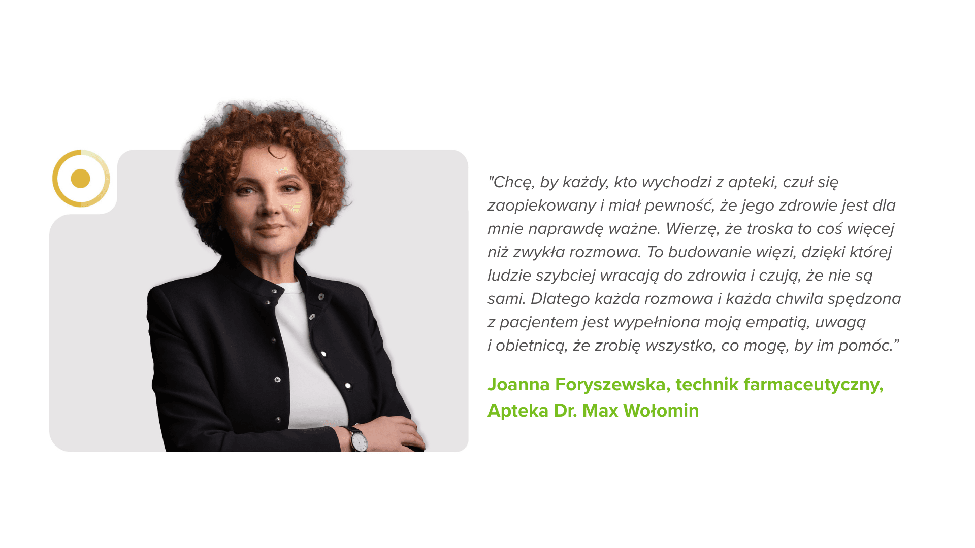 Tutaj nie chodzi tylko o wydanie leku, czy polecenie konkretnego produktu. Głównym celem jest i zawsze musi być zbudowanie relacji opartej na zaufaniu, empatii i uważności - bo pacjent, który czuje się wysłuchany i zaopiekowany to nasz największy priorytet.